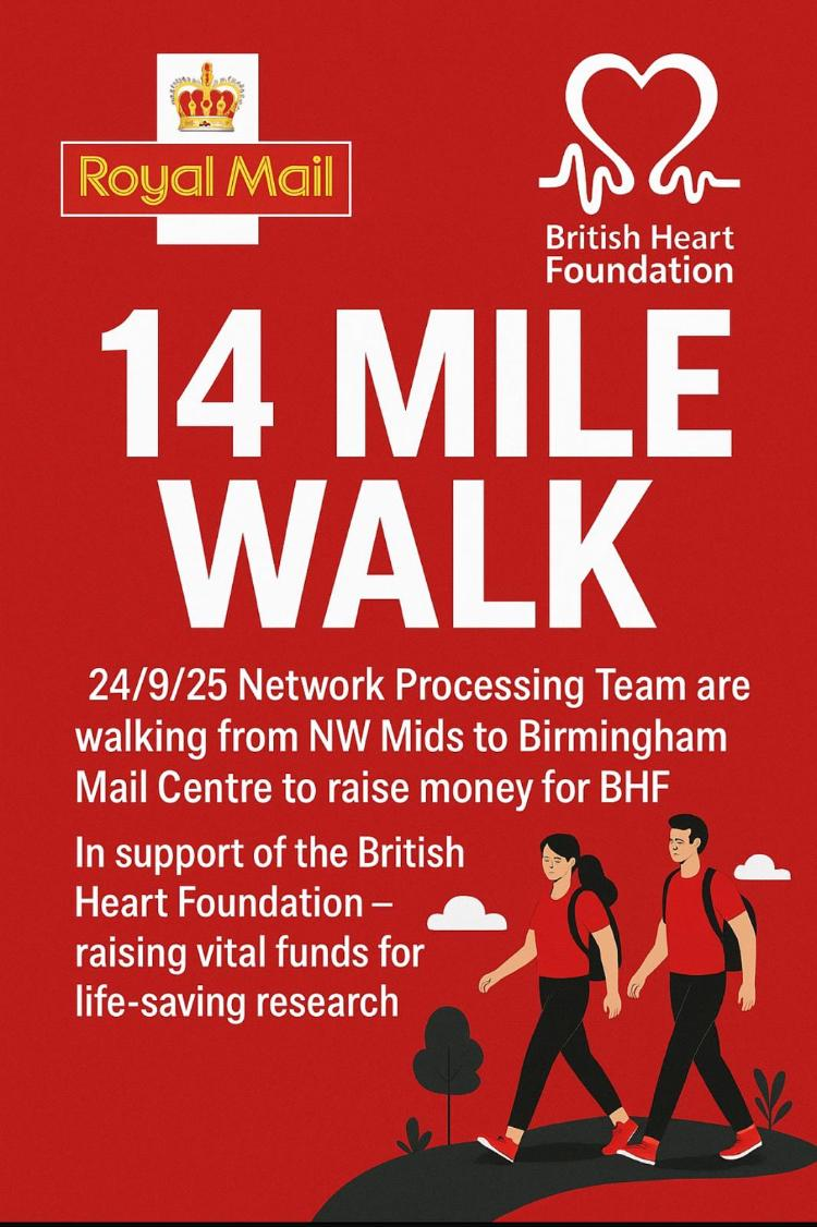On Wednesday 24th September, as a Processing team we will be lacing up our trainers and hitting the road– walking 14.7-miles from North West Mail Centre to Birmingham Mail Centre. We’re walking with purpose, raising vital funds for the British Heart Foundation.