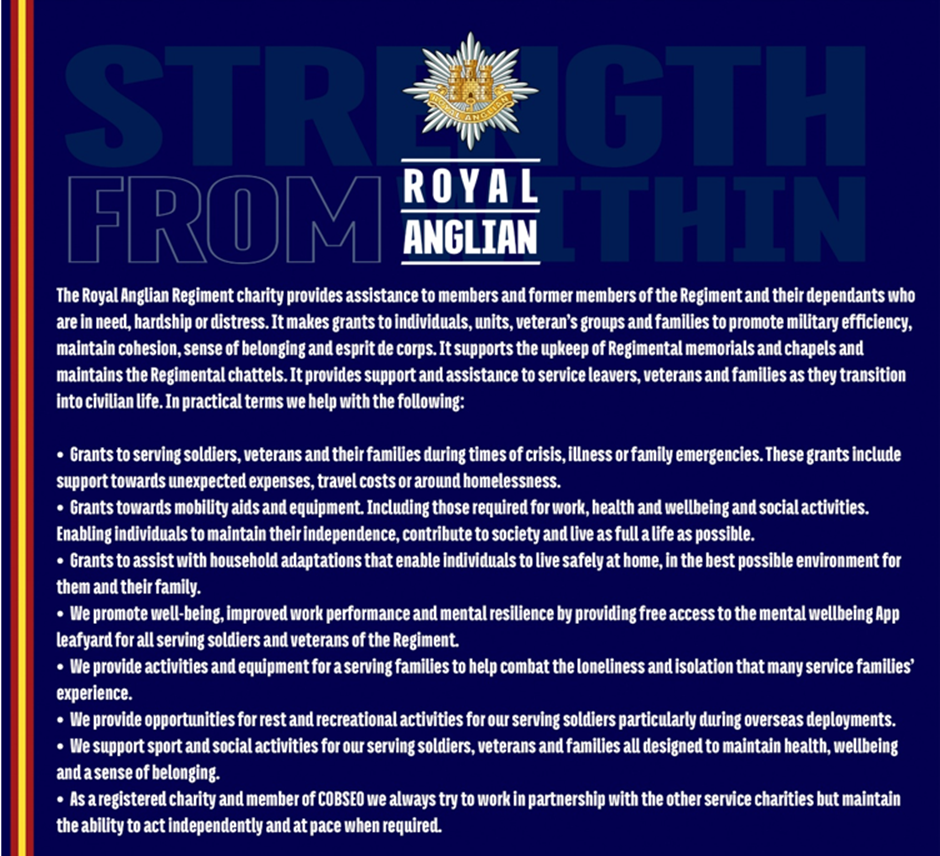 We are a group of Royal Anglian Regiment Veterans who have over 100 years of service between us. We’ve served together on operations in Northern Ireland, Iraq & Afghanistan as well as on exercises and training all around the world. Throughout our careers we were well supported by the Royal Anglian Regiment Charity. It’s now great for us to have the opportunity to raise funds to support those members of our Family who are in need. Of course we are also members of the wider community and to be able to support the Addenbrookes Charitable Trust that does so much good is equally important.